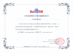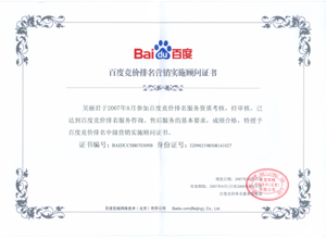 鹽城思科網(wǎng)絡工程有限公司作為百度鹽城地區(qū)總分銷商,在2007年度參加百度競價排名服務資質(zhì)考核中,經(jīng)過公司全體員工們的共同努力,再創(chuàng)佳績,其中通過中級服務認證考核8人,3人優(yōu)秀,通過率達95%,被全球最大中文搜索引擎——百度在線(北京)有限公司再次授權(quán)百度競價排名鹽城地區(qū)唯一客戶服務中心。盡善盡美的售后、全心全意的服務,思科人將用十二分的熱忱等待您的惠顧,共創(chuàng)新紀元!